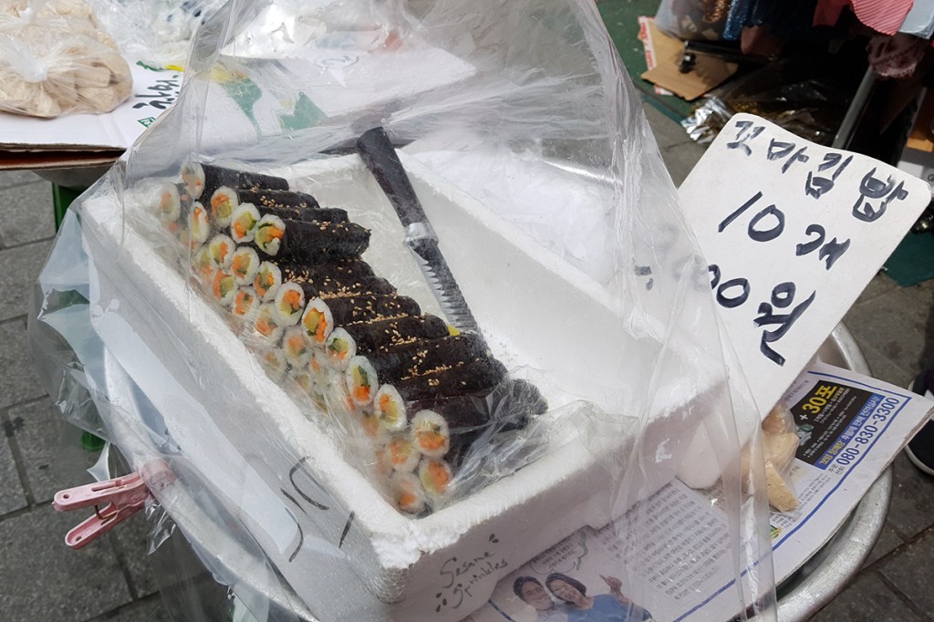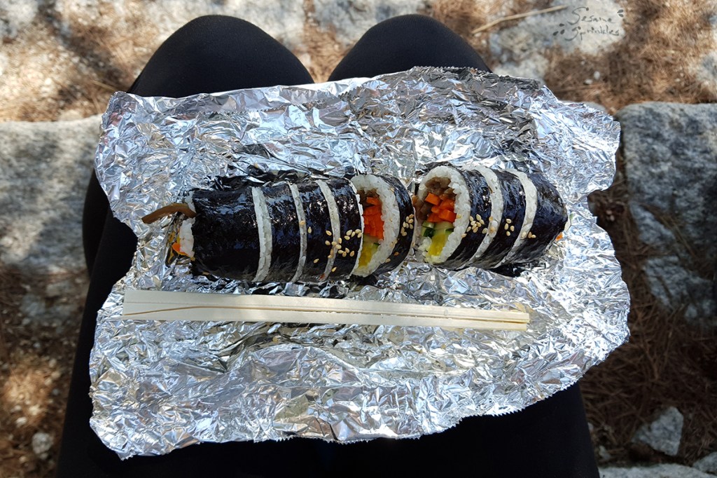 🍣 Kimbap (김밥) is Korea’s classic “outdoor meal”. Be aware that Kimbap sold by street vendors is normally made in advance and their filling includes fish, ham and egg, plus vegetables. 🐟🥓🥚 Thus it may be difficult to find a veggie-friendly version on location. Sometimes, vendors offer small rolls of Kimbap (꼬마김밥 / 미니김밥) which do not contain any filling or only vegetables – those should be vegan by default. If you want to eat a large Kimbap that is filled with vegetables (and egg), stop at a bunsik jeom (분식점) and order a customized vegan/vegetarian Kimbap, before you head to the mountain. You can eat Kimbap with chopsticks – normally wooden chopsticks are included in your order of Kimbap-to-go 🥡. Or simply use your hands! 🥢👌