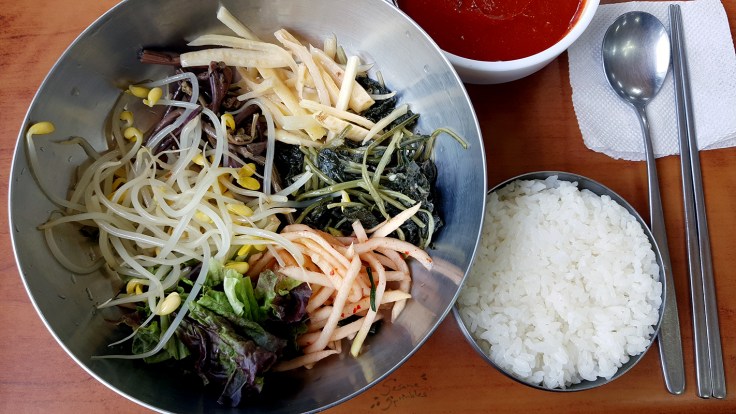 - 🥣 bibimbap with wild herbs (aka mountain greens) 산채비빔밥: Vegetarian when served with egg, but easily veganized by omitting egg topping.