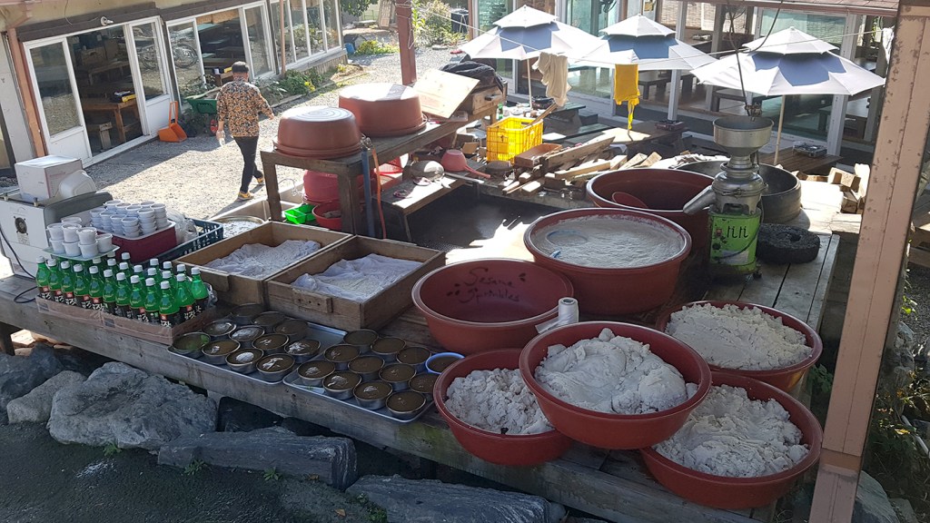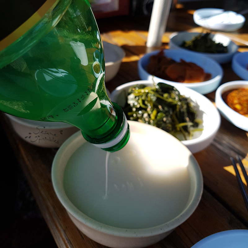 🍶 Aside from water, tea or grain drinks, certain Koreans bring (frozen) Makgeolli (막걸리), an alcoholic rice drink, on mountain hikes. They may drink it when they have reached their goal and enjoy the view from above during a picnic. When you see Korean hikers with a red face, it often means that they A) did not use sun screen, or B) are very hot and sweating, or C) have drunk alcohol while hiking.*** [The latter being the most frequent case, from personal experience. 🤭] Needless to say, it is safer to drink alcohol after hiking, e.g. at one of the restaurants at the entrance of hiking areas. [see below!]