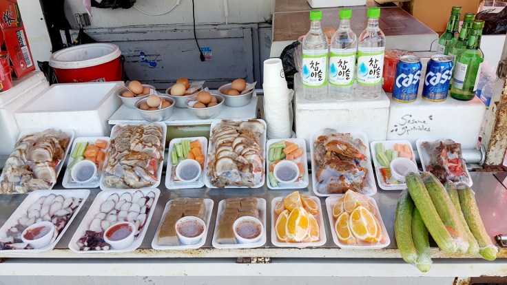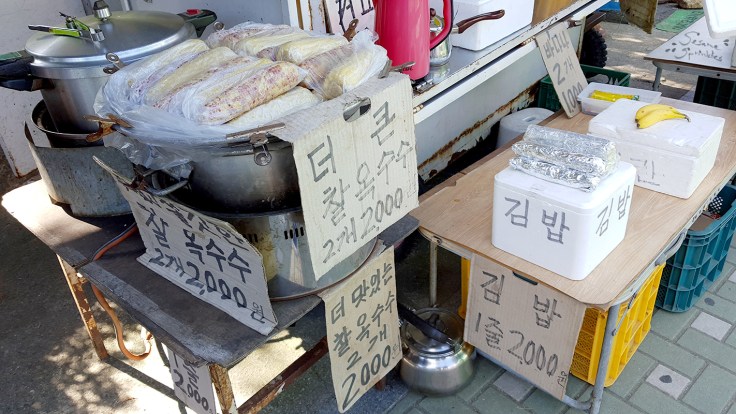 🌽 Steamed or cooked corn is a typical street food in Korea. The most common variety of corn is called chal-oksusu (찰옥수수), which is either white, blue or speckled. [Sweet yellow corn is rather foreign here!] Eating corn on the cob may require you to wash your hands afterwards, unless you know how to eat it without making your hands sticky. It is often sold wrapped in plastic bags, which may serve as a waste bag during your hike. The leftover corncob might be the first thing you put into it.