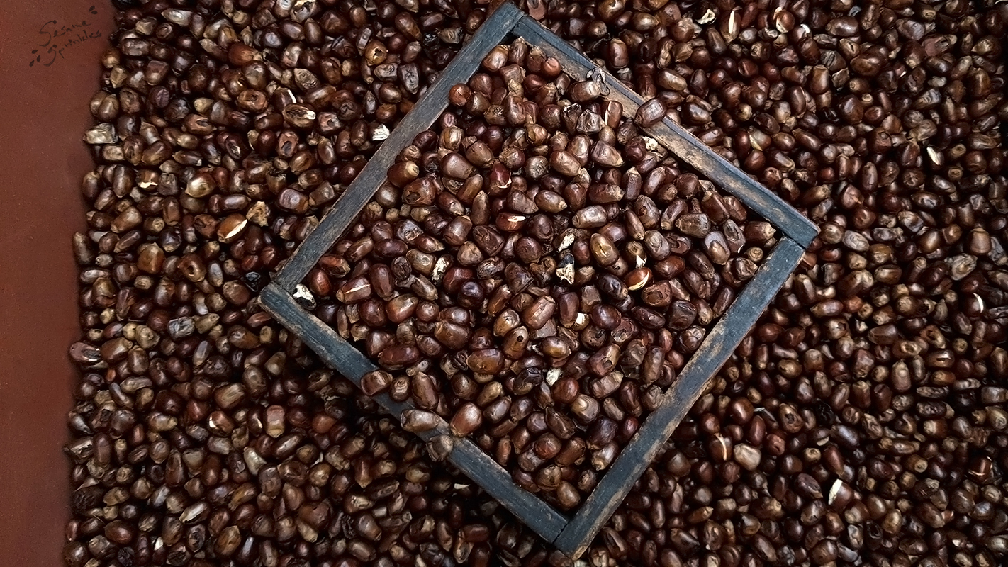 Apart from translucent glutinous corn, diverse yellow-colored corn and unripe sweet corn, there is yet another type of corn in Korea: Jwi-ippal oksusu (쥐이빨옥수수) which translates to “mouse tooth corn”. The ears of this kind of corn are distinctly smaller and its kernels are sharp and pointy, apparently reminiscent of the tiny teeth of mice. 🐁 According to it being labelled as “native” (tojong 토종), it’s supposed to be a Korean cultivar of corn.